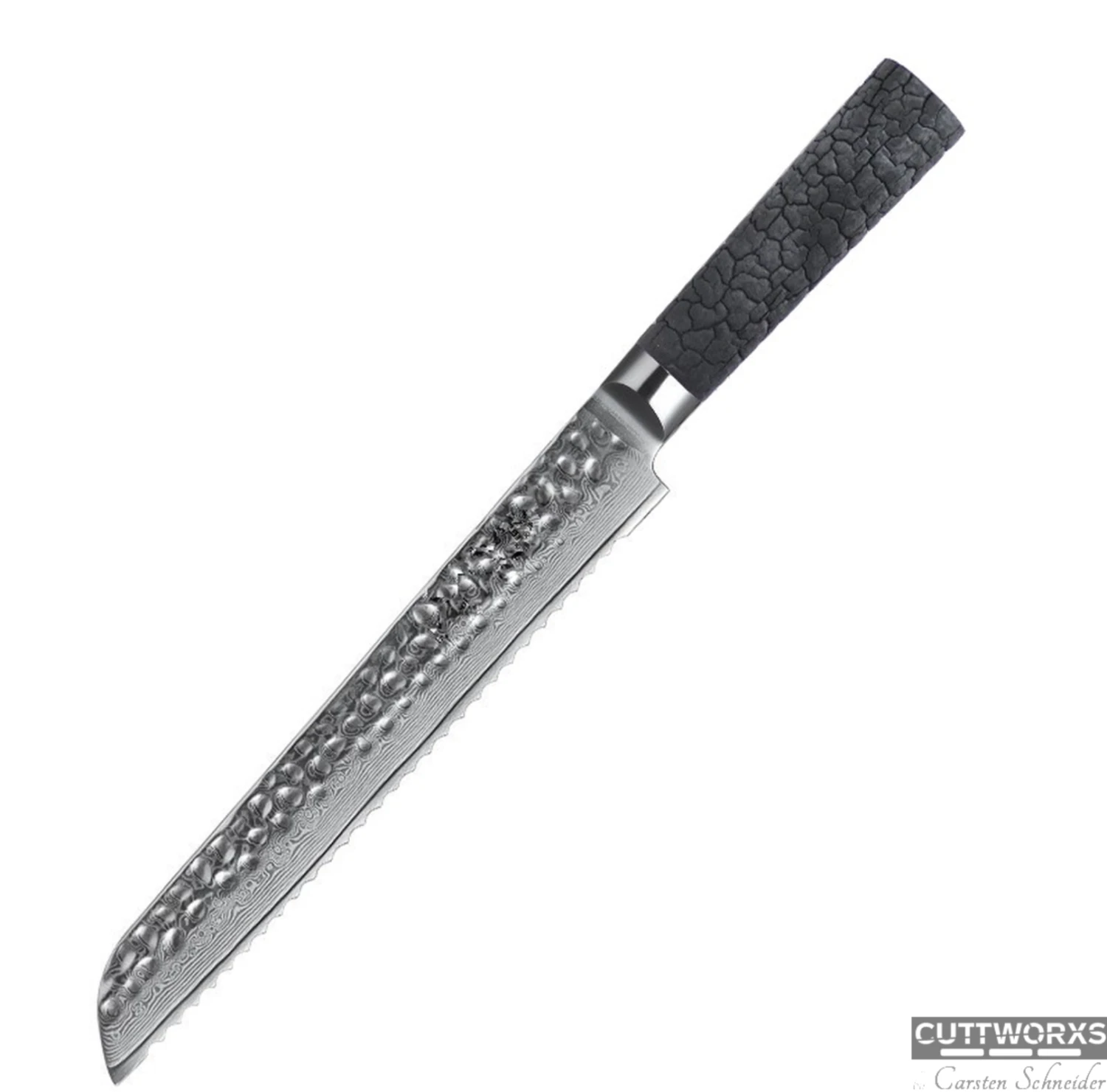 Cuttworxs brood mes geniet een zeer speciaal ontwerp. Het vlijmscherpe gekartelde lemmet van dit mes springt in het oog door zijn bijzondere vormgeving. Het gehamerde lemmet, de fijne damaststructuren en tenslotte het met FlameWOOD® gepatenteerde handvat van gebrand hout maken dit mes uniek. Zoals alle Cuttworxs messen ligt het Brood mes perfect in de hand en zorgt het voor de perfecte snede.