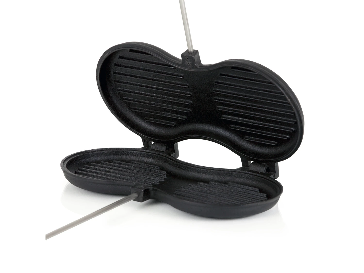Met de Petromax Hamburgerijzer maak je perfecte hamburgers. Het geribbelde patroon binnenin het ijzer geeft het mooie en knapperige grill patroon aan de burger. In deze handige gietijzeren vorm kan je twee hamburgers tegelijk bereiden. Dankzij de platte, vlakke houten handgrepen en de vergrendelhaak kun je het hamburgerijzer veilig sluiten en vasthouden. En door de lengte van 70 cm kan je op een mooie afstand van het vuur de jouw hamburgers perfect en veilig bakken. De Petromax Hamburgerijzer is gemakkelijk schoon te maken omdat je beide kanten van elkaar kunt halen. Tevens maak je met een Petromax Schraper Geribbeld makkelijk weer schoon, ook tussen het grill patroon.